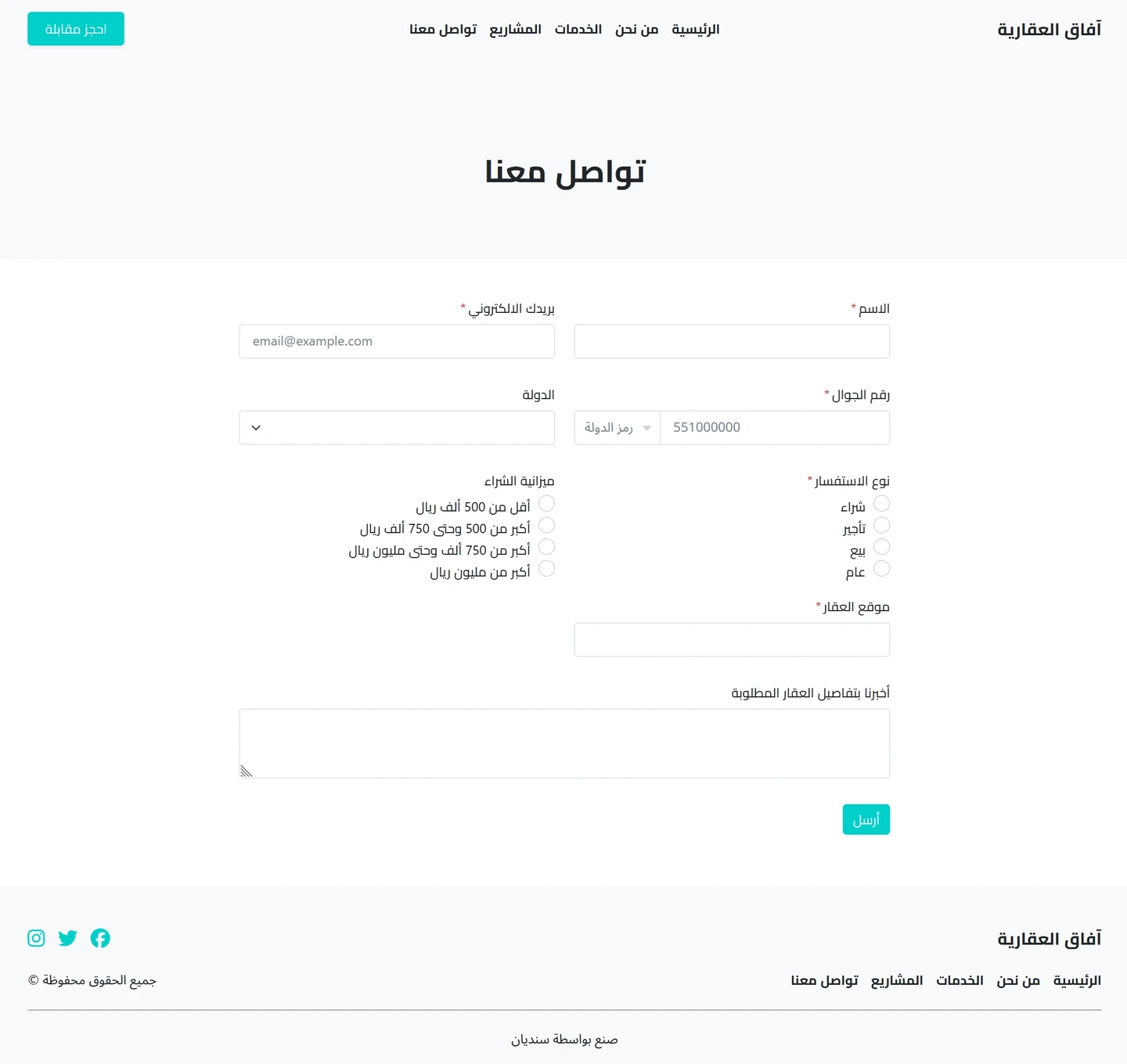 نموذج تواصل تم إنشاؤه باستخدام أداة زيتون وإدراجه في موقع عقاري